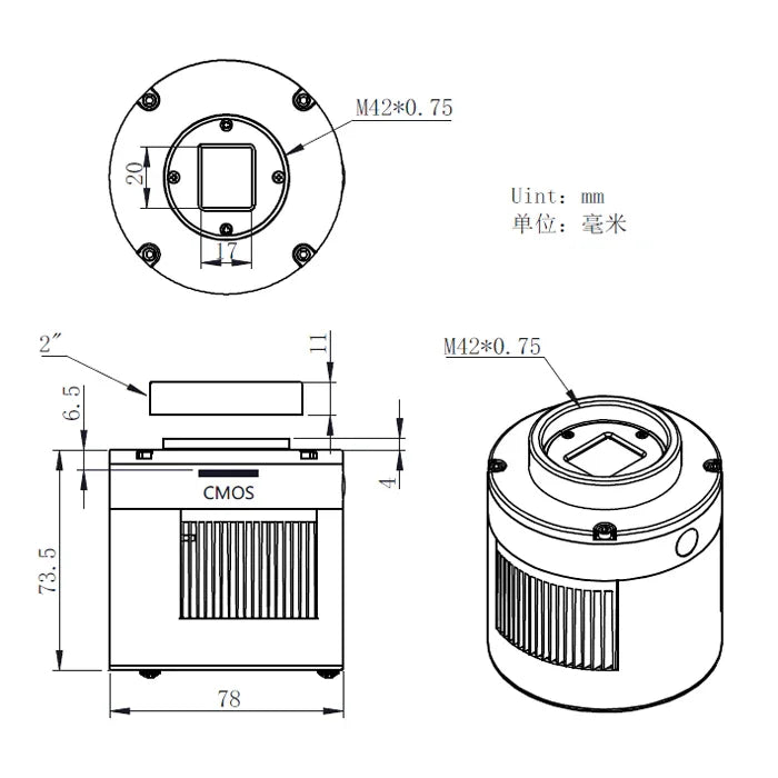 The camera has a diameter of 78mm and weighs 470 grams (16.8 oz). It comes with a padded carrying bag, M42-M48 adapter, M54-M48 21mm extender and M48-M48 16.5mm extender, 2” cover, USB3.0 and USB2.0 cables, and a quick-start guide.