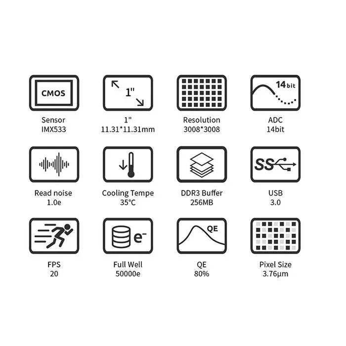 - ZWO ASI533MC-Pro cooled color astronomy camera with a 1”-format square (11.3mm x 11.3mm) Sony IMX533 CMOS sensor